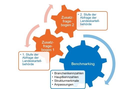 Der Leistungsvergleich zeichnet sich gegenüber anderen landesweiten Vergleichen bzw. Benchmarkingprojekten dadurch aus, dass integriert bzw. zusätzlich auch die Abfragen der Landeskartellbehörde (LKB) abgebildet und für mögliche, eigene Analysen vorgehalten werden sollen. Hierbei erfolgt die Abfrage der Landeskartellbehörde in zwei aufeinanderfolgenden Zeitabschnitten. Mit der ersten Abfrage sollen die Unternehmen identifiziert werden, die hinsichtlich Ihrer Preisgestaltung auffällig sind und mit der zweiten Abfrage sollen dann die Preisunterschiede hinterfragt bzw. analysiert werden. Parallel zur zweiten Abfrage der Landeskartellbehörde erfolgt im Leistungsvergleich dann auch die Datenerhebung zum Benchmarking, die die Erklärung der Preisunterschiede zusätzlich erklären hilft.